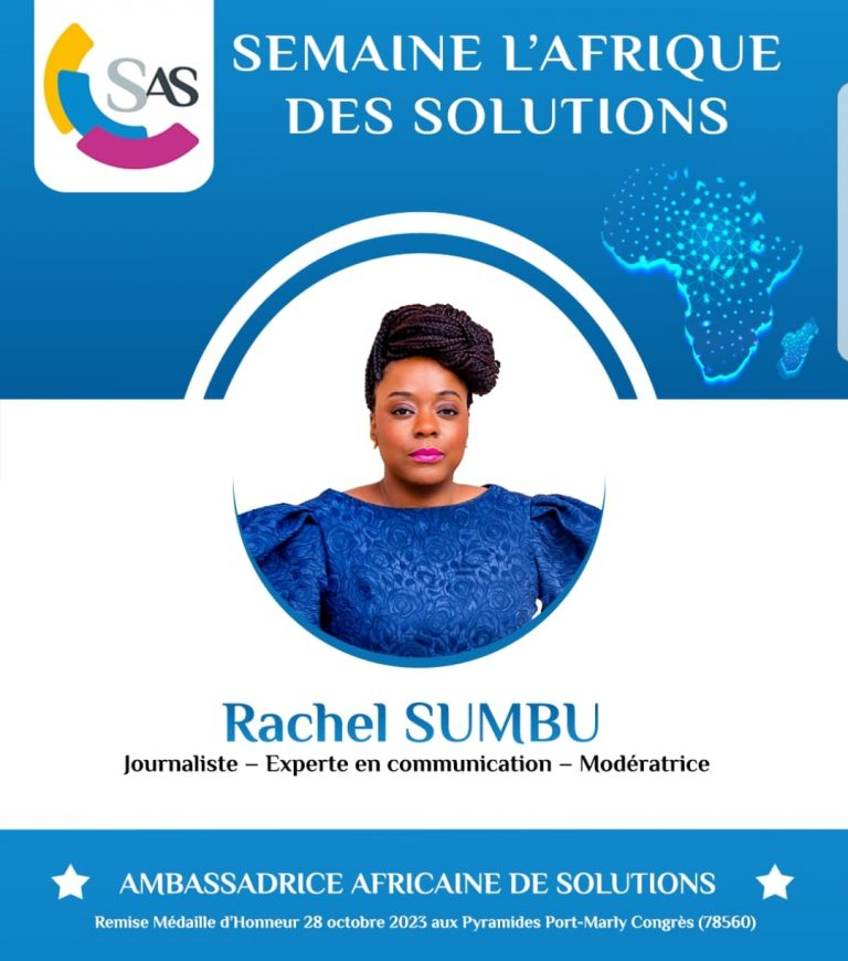 Rachel Sumbu, sera décorée « Ambassadrice Africaine de Solutions » au regard de son parcours inspirant, audacieux, de ses actions visant à mettre en lumière les initiatives des afro descendants contribuant au rayonnement de l’Afrique, et de son association visant à favoriser l’accès à l’éducation des jeunes mères.